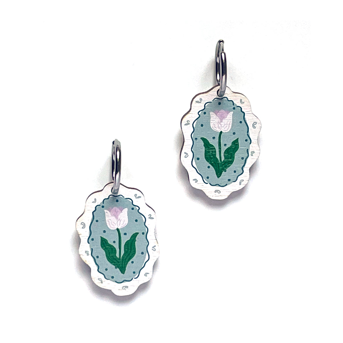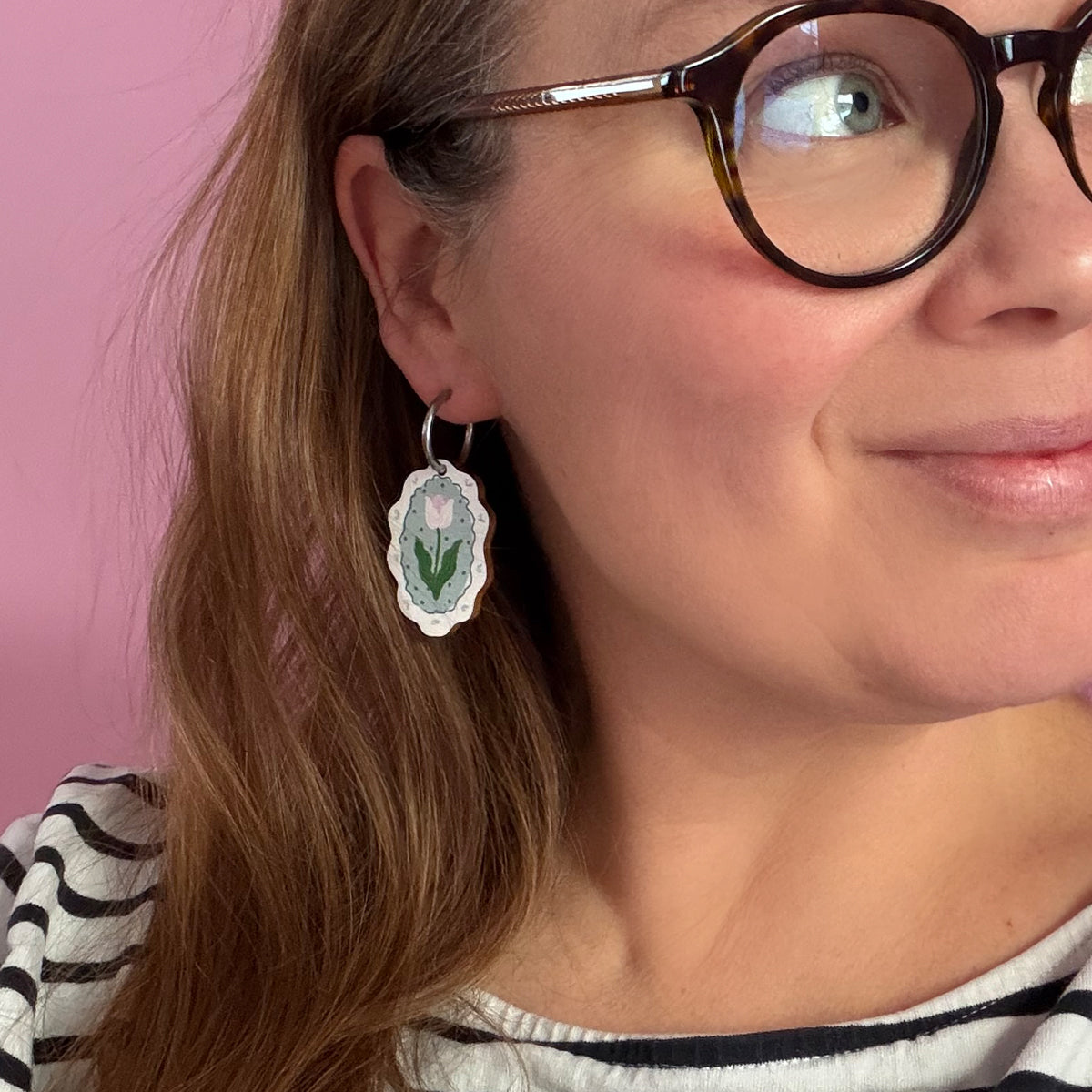 The pattern is digitally printed on Finnish birch plywood and then laser cut. The print is on both sides of the earring.